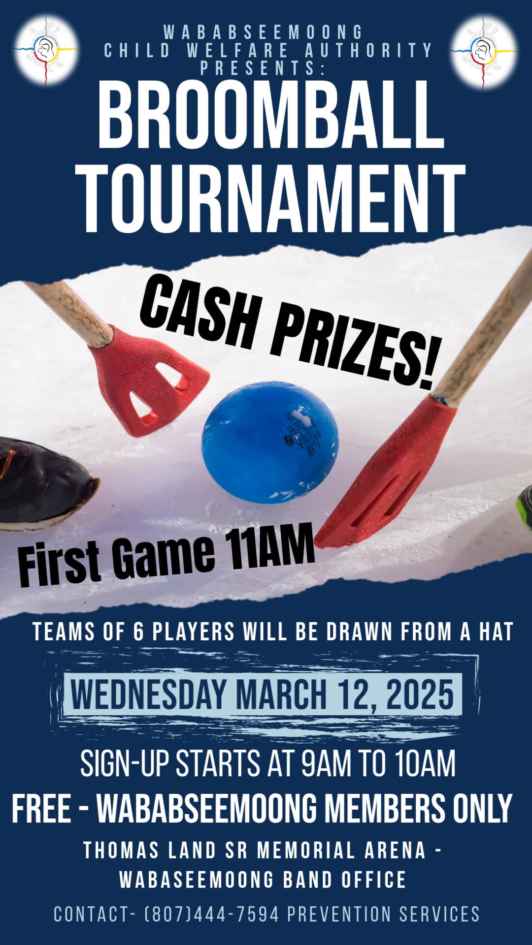 Wabaseemoong Child Welfare Authority Presents: Broomball Tournament. Cash Prizes! SeeRead More...